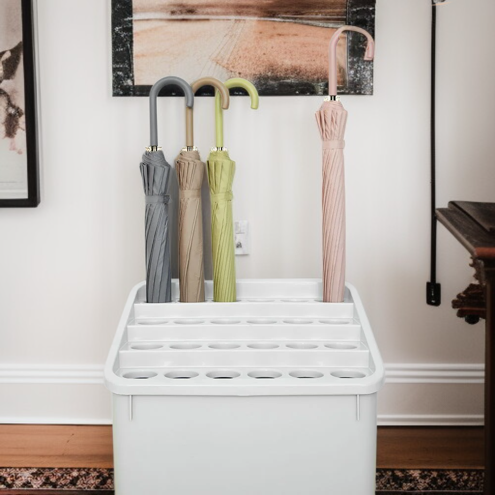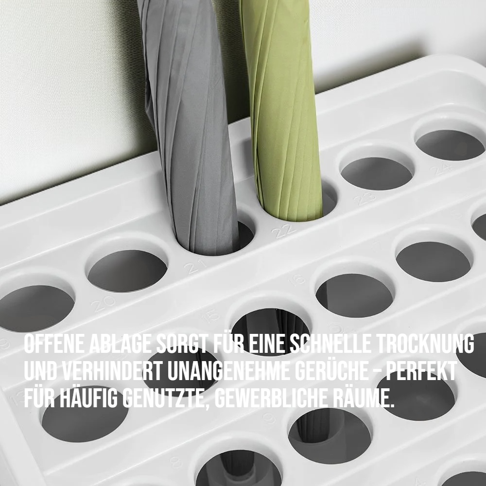 ● Großzügiges und elegantes Design bietet ausreichend Platz für mehrere Regenschirme und Stiefel, ideal für Eingangsbereiche von Hotels, Büros oder Restaurants. ● Offene Ablage sorgt für eine schnelle Trocknung und verhindert unangenehme Gerüche – perfekt für häufig genutzte, gewerbliche Räume. ● Hochwertige, robuste Materialien garantieren eine lange Lebensdauer und widerstehen täglicher Beanspruchung in stark frequentierten Bereichen. ● Praktischer und stilvoller Hingucker, der Ordnung schafft und Ihren Empfangsbereich professionell und einladend wirken lässt. ● Einfache Reinigung und Pflege – der Schirmhalter bleibt stets hygienisch und trägt zu einem gepflegten Erscheinungsbild Ihres Unternehmens bei.