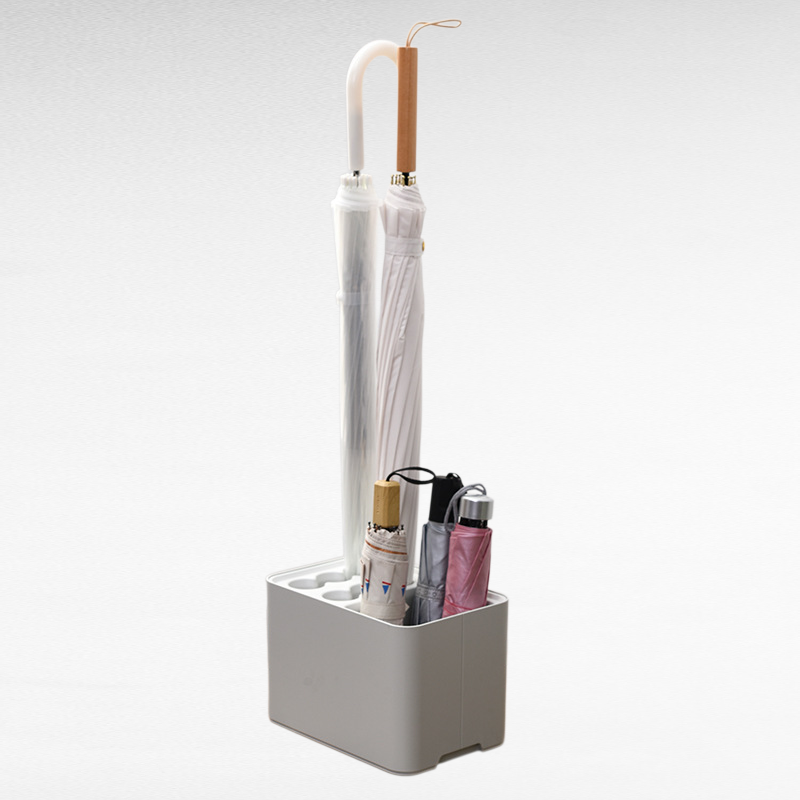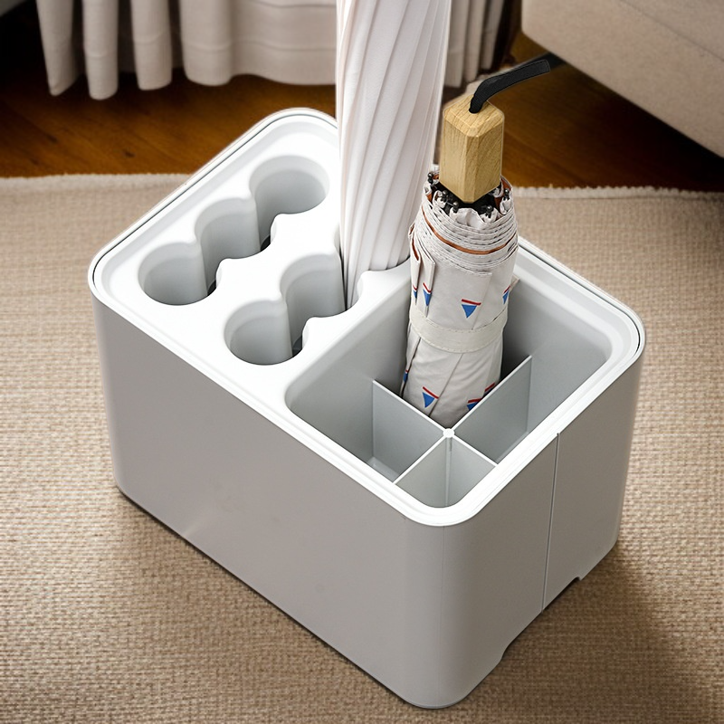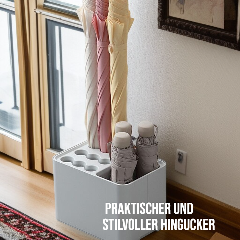 :Moderner Regenschirmhalter mit Stiefelfach und offener Ablage